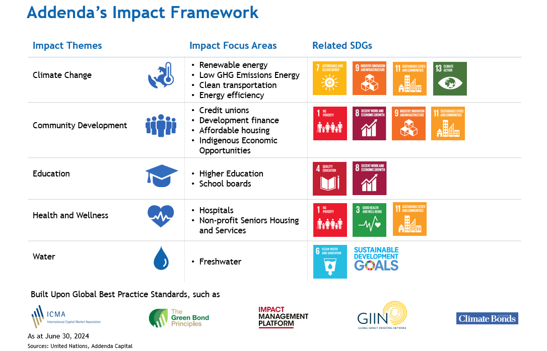Our Impact Fixed Income Strategy intentionally seeks to create both compelling financial returns and positive social and/or environmental impact that can be adequately measured, tracked, and reported. Launched in 2018, the Addenda Impact Fixed Income Pooled Fund reached nearly $530 million as at June 30, 2024.