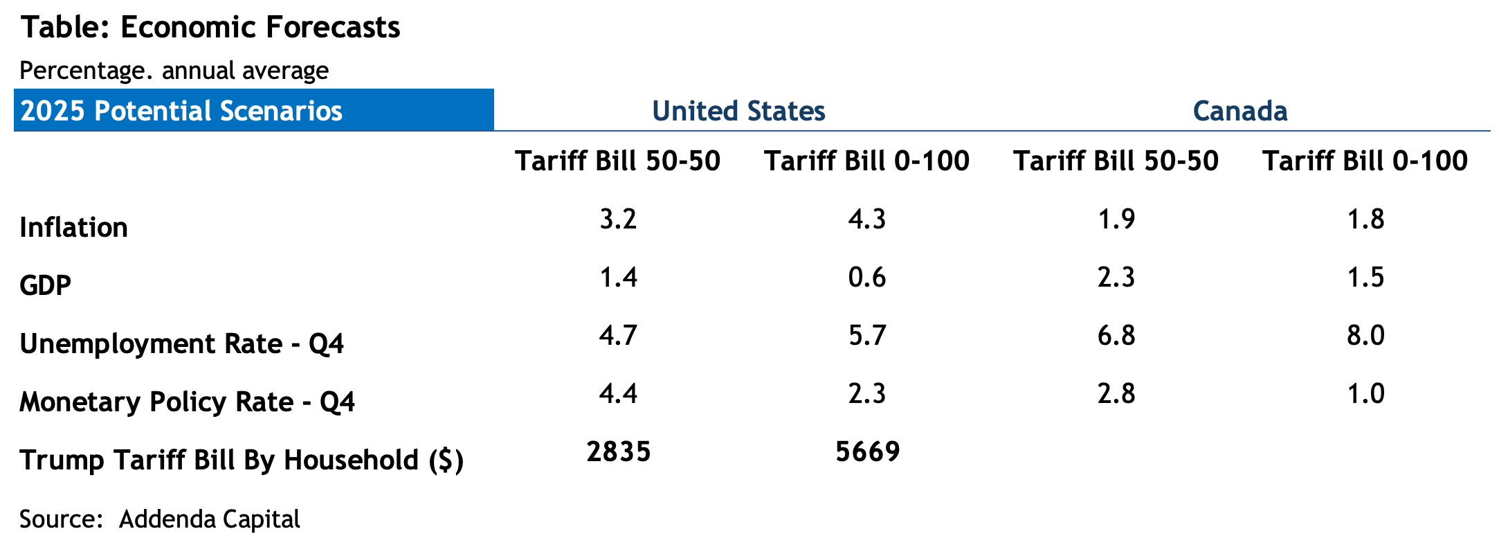 The figures in the table are slightly lower, as they are expressed as an annual average. In terms of real GDP, the US economy narrowly avoids a recession in the second half of the year if companies absorb half of the bill, but the economy cannot avoid a downturn when the bill is fully passed on to households. The tax amounts to almost 5700 dollars per household in the second scenario. As a result, the economy is plunging into a major consumer recession. In Canada, the economy is also entering a major recession in the scenario that suggests the economic cycle is coming to an end south of the border.