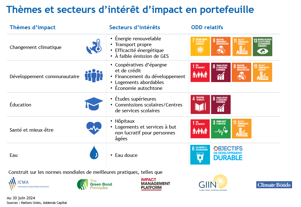 Notre stratégie en revenu fixe d’impact cherche intentionnellement à générer à la fois un rendement financier intéressant et des retombées positives sur le plan social ou environnemental pouvant être adéquatement mesurées, suivies et communiquées. Lancé en 2018, le Fonds commun Addenda revenu fixe – investissement d’impact atteignait près de 530 millions de dollars au 30 juin 2024.