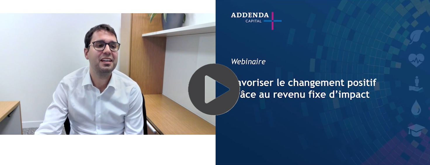 ACCUEIL Articles et nouvellesFavoriser le changement positif grâce au revenu fixe d'impact Articles et nouvelles Vidéos S'abonner Insights & News ...Videos Favoriser le changement positif grâce au revenu fixe d'impact Date de publication : 4 juin 2025 Catégorie : Articles VidéosInvestissement durable Les investisseurs institutionnels cherchent à accomplir davantage avec leurs portefeuilles en générant des rendements attrayants tout en faisant une différence concrète dans leurs collectivités. Une stratégie de revenu fixe d’impact produit des résultats durables sans faire de compromis sur la performance. Lors d'un récent webinaire animé par Alexandre Zarbatany, notre directeur, Partenariat avec la clientèle et développement des affaires, Réjean Nguyen, le directeur principal en Investissement durable chez Addenda, a fait part de précieux renseignements sur cette stratégie et de nouvelles perspectives en matière de durabilité. Voici quelques-uns des principaux éléments abordés : Pour découvrir en quoi consiste l’investissement d’impact Démystifiez les croyances courantes sur l'investissement d'impact grâce à des perspectives claires et factuelles Explorez les cadres permettant d’évaluer la valeur sociale et environnementale des titres Découvrez les thèmes clés qui animent le marché de l’impact Prenez connaissance de la profondeur et du potentiel du paysage canadien Pour obtenir des renseignements concrets Apprenez comment un cadre d’évaluation de l’impact permet d’évaluer les obligations Consultez des études de cas montrant l’investissement d’impact à l’œuvre Visionnez l'entièreté de notre webinaire: La quête constante de valeur ajoutée addendacapital.com © Addenda Capital inc., 2025. Tous droits réservés. Toute reproduction de ce document est interdite sans autorisation préalable.