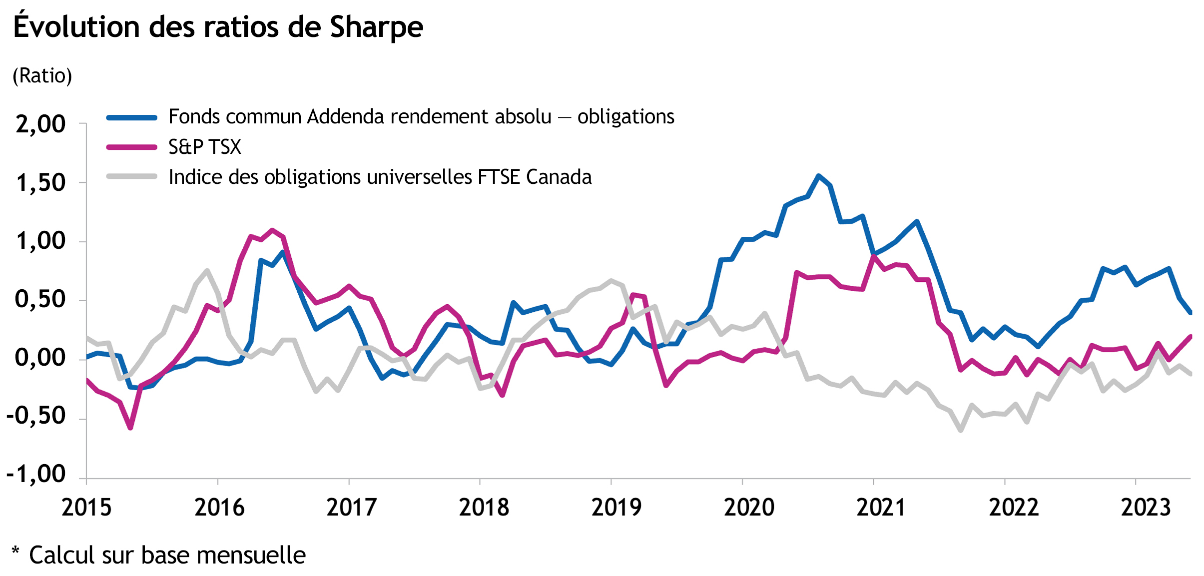 Qui plus est, puisque le rendement ajusté pour le risque du Fonds est élevé, son ajout à un portefeuille traditionnel composé d’actions et d’obligations en bonifie le profil rendement-risque Pour ceci, nous utilisons le ratio de Sharpe, qui mesure le rapport entre la valeur ajoutée et la prise de risque pour la générer. Comme le démontre le graphique ci-bas, le Fonds surpassait souvent l’une des deux catégories d’actifs avant 2019. Depuis, il les dépasse sur une base constante.