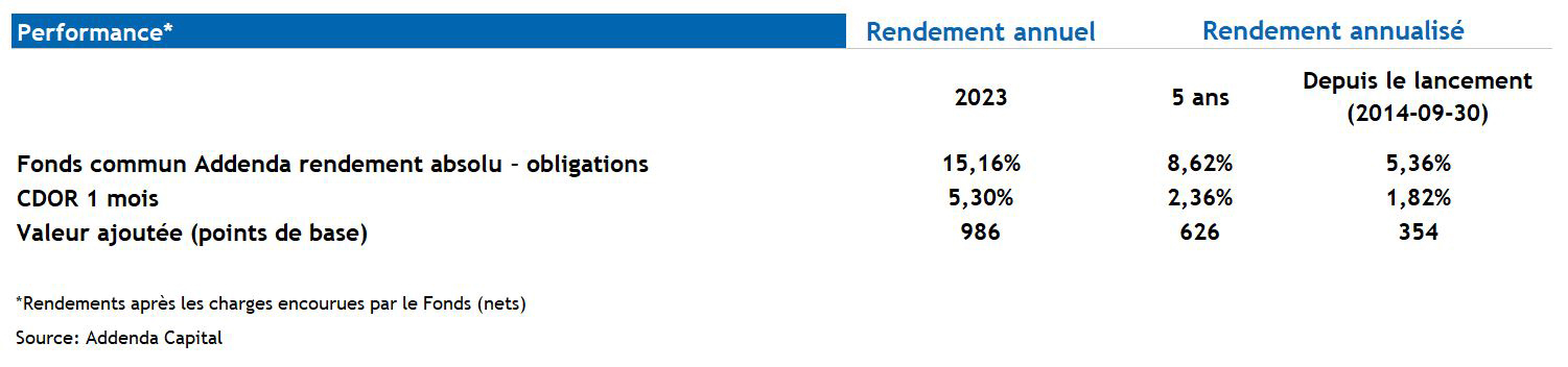 Notre Fonds commun Addenda rendement absolu – obligations (le « Fonds ») a généré un rendement annualisé de 5,36 % depuis sa création le 30 septembre 2014 (au 31 mars 2024). Son rendement a atteint 15,2 % en 2023, tandis que son rendement annualisé sur cinq ans s’est chiffré à 8,62 % (au 31 mars 2024).